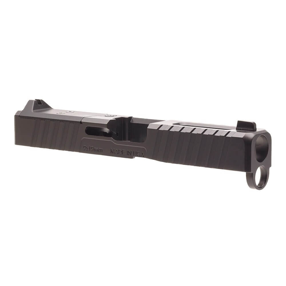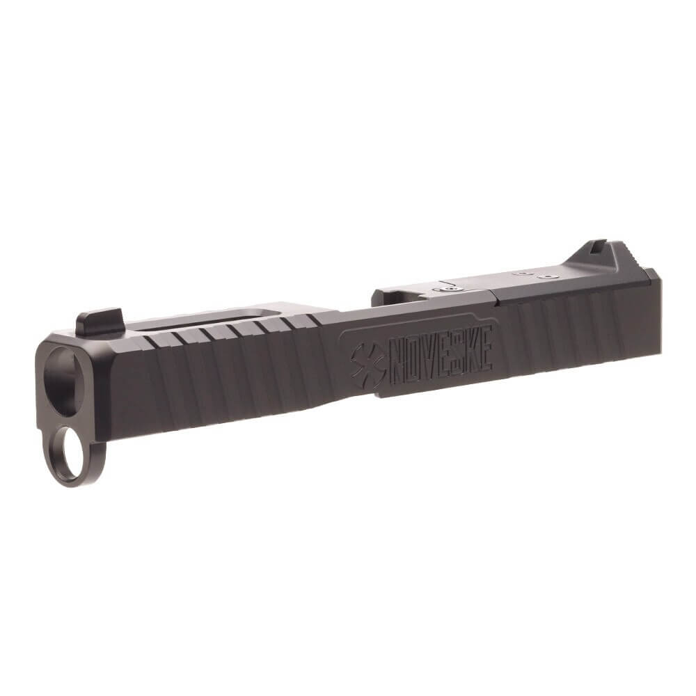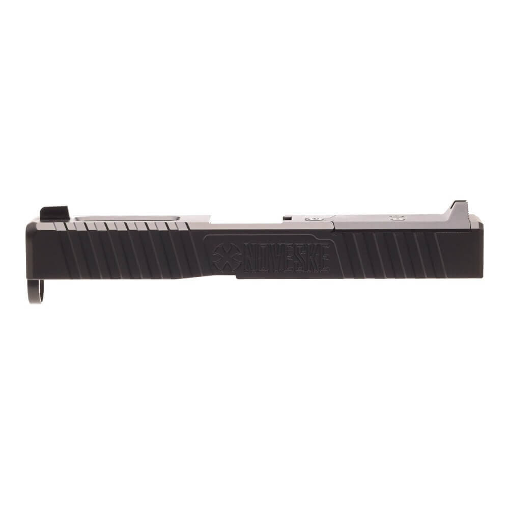 Enhanced front and rear serrations improve slide manipulation, while a chamfered top window optimizes weight distribution for balanced handling. Each slide includes a serrated black front sight, a rear cover plate with a serrated black rear sight, a Noveske-marked Glock-compatible back plate, and all necessary mounting hardware.